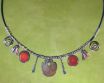 Ein massives Collier aus Silber der Probe 925, das Silber wurde rötlich patiniert und geschwärzt, somit absichtlich auf "alt"  und archaisch gemacht, mit 2 echten Korallen. Gewicht ca.30 gr, Länge des Lederbandes mit Handgemachten Silber Verschluß 40cm,